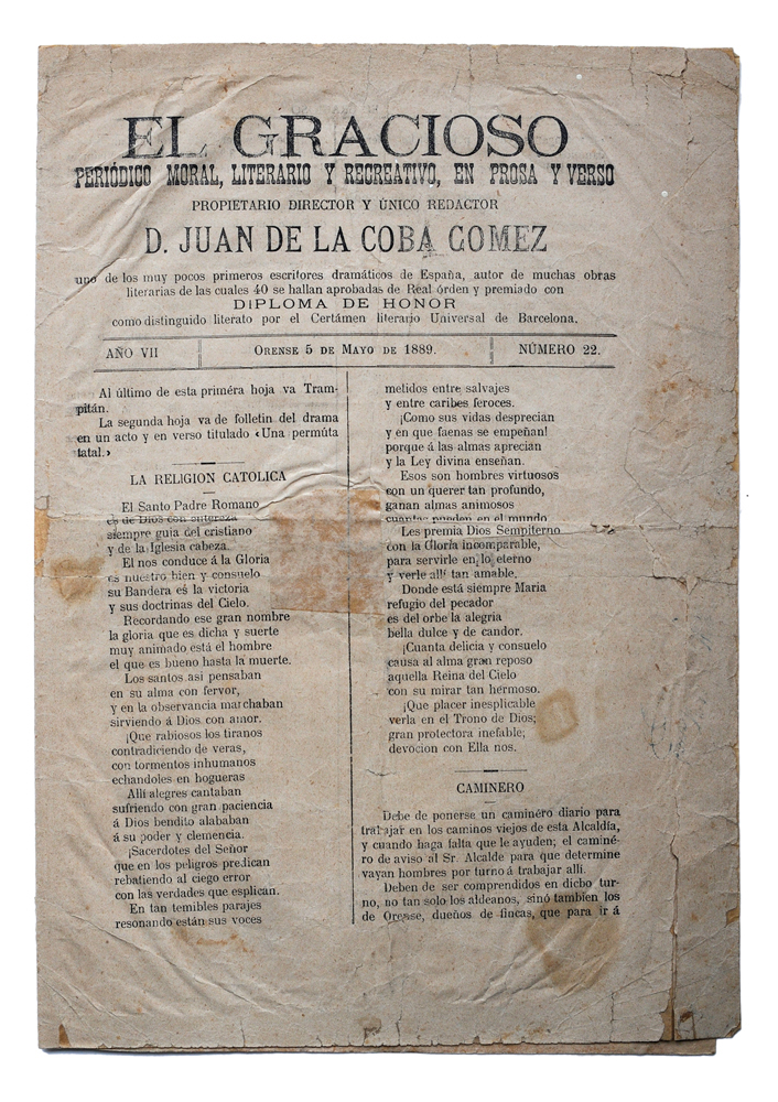 Segundo a información proporcionada por Roberto Aneiros García e María del Pilar Núñez Sánchez (febreiro de 2016, Museo Arqueolóxico Provincial de Ourense), El Gracioso levaba o subtítulo “Periódico moral, literario y recreativo, en prosa y verso”. O seu propietario, director, redactor, impresor, distribuidor e único lector era Xan da Coba. Contaba con dúas follas, nun total de catro páxinas, sen orde nin sentido interno. Trátase dunha publicación miscelánea que incluía novas locais e xornalísticas, algún poema, ás veces de contido relixioso, e os textos literarios El Trampitán e Una permuta total.